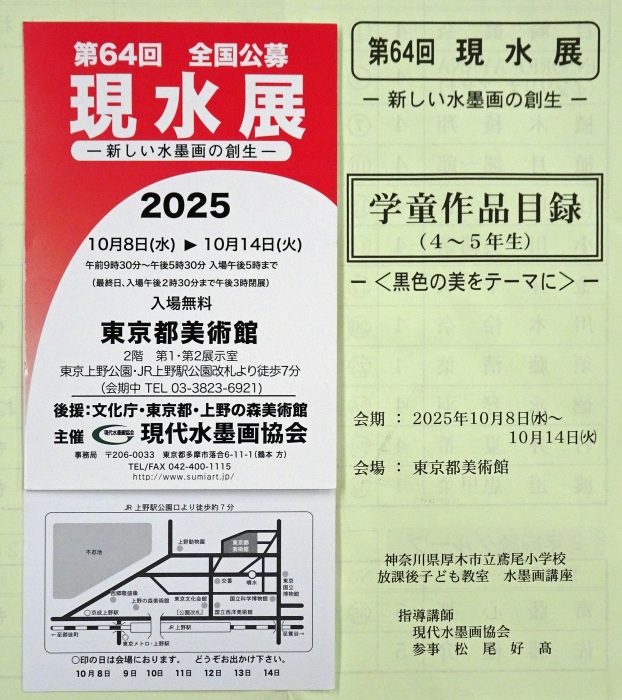 第64回現水展 & 鳶尾小・学童水墨画作品展(松尾指導) 同時開催のご案内 ◆会期: 2025/10/8㈬~10/14㈫ 09:30~17:30(入場17時まで) ◆会場: 東京都美術館 東京上野公園内 ◆鳶尾小学校学童水墨画作品を同時展示いたします(松尾指導) *詳細は、下のDMと、目録をご覧ください